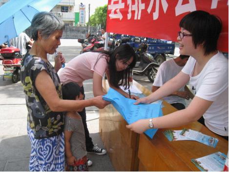 圖為工作人員向居民發(fā)放公益環(huán)保袋