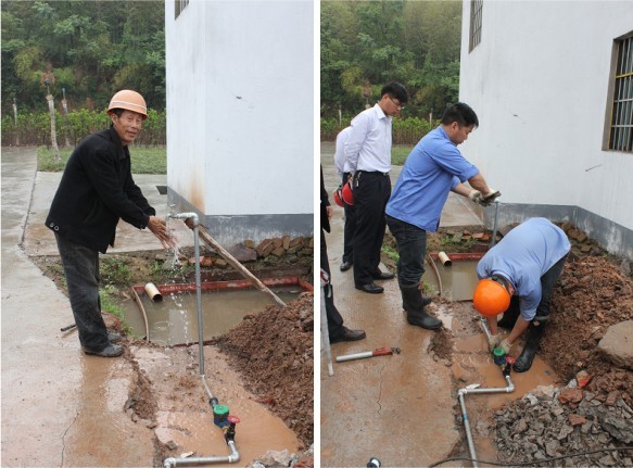 為盡快幫助村民解決用水問(wèn)題,安裝小組冒雨前往。在安裝現(xiàn)場(chǎng),我們看到有人在使用套絲機(jī),有人在接水管,大伙忙的不亦樂(lè)乎。經(jīng)過(guò)2個(gè)小時(shí)的奮戰(zhàn),順利為其接通水源,安好水表,并裝好了水龍頭。當(dāng)現(xiàn)場(chǎng)看到水龍頭流出水的那瞬間,大家的心情都非常激動(dòng),費(fèi)某的臉上更露出了久違的笑容,欣喜的用手接起了新家的“第一股清泉”。